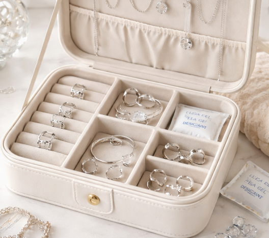 은 주얼리를 착용하지 않아도 변색이 진행되는 이유는, 보관 중에도 공기와 지속적으로 접촉하기 때문입니다. 특히 개방형 보관함이나 실내 공기 순환이 잦은 공간에서는 황 성분 노출이 누적됩니다. 여기에 습도가 더해질 경우, 은 표면에 미세한 수분막이 형성되어 화학 반응을 촉진합니다. 따라서 은 주얼리 보관의 핵심은 노출 시간을 줄이고, 반응 조건을 차단하는 것입니다.